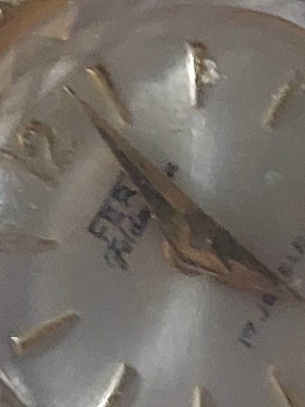 Dit is een vintage gouden hanger van het merk Ferlin, met een parel en een bladmotief. De hanger heeft een ingebouwd horloge met een wijzerplaat waarop "Ferlin", "17 Jewels" en "Swiss Made" staat.
